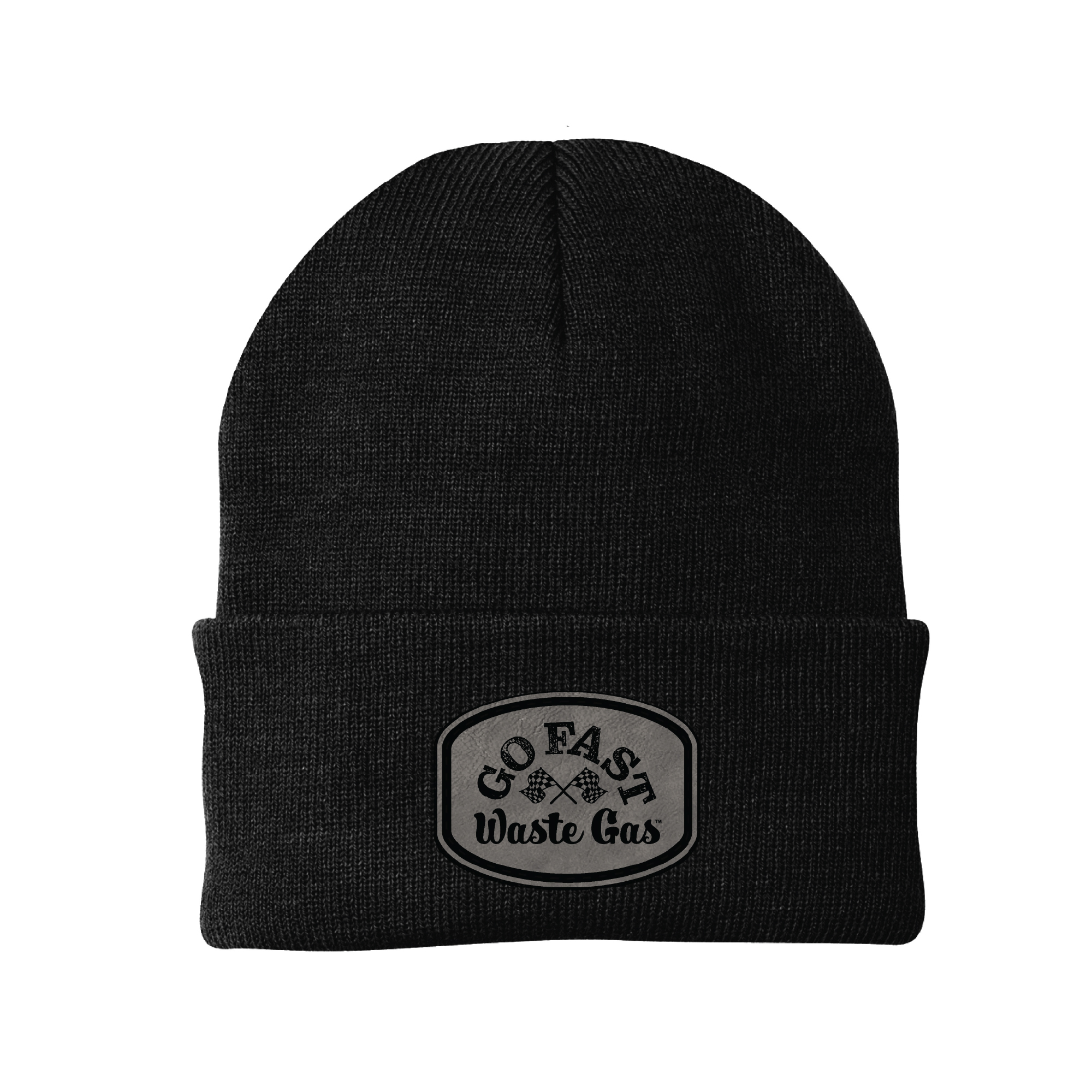 A warm, soft, cold-weather essential built for early rides, late nights, and winter race days. This classic cuffed beanie features a 3″ fold and our signature etched grey leather GO FAST WASTE GAS™ patch.