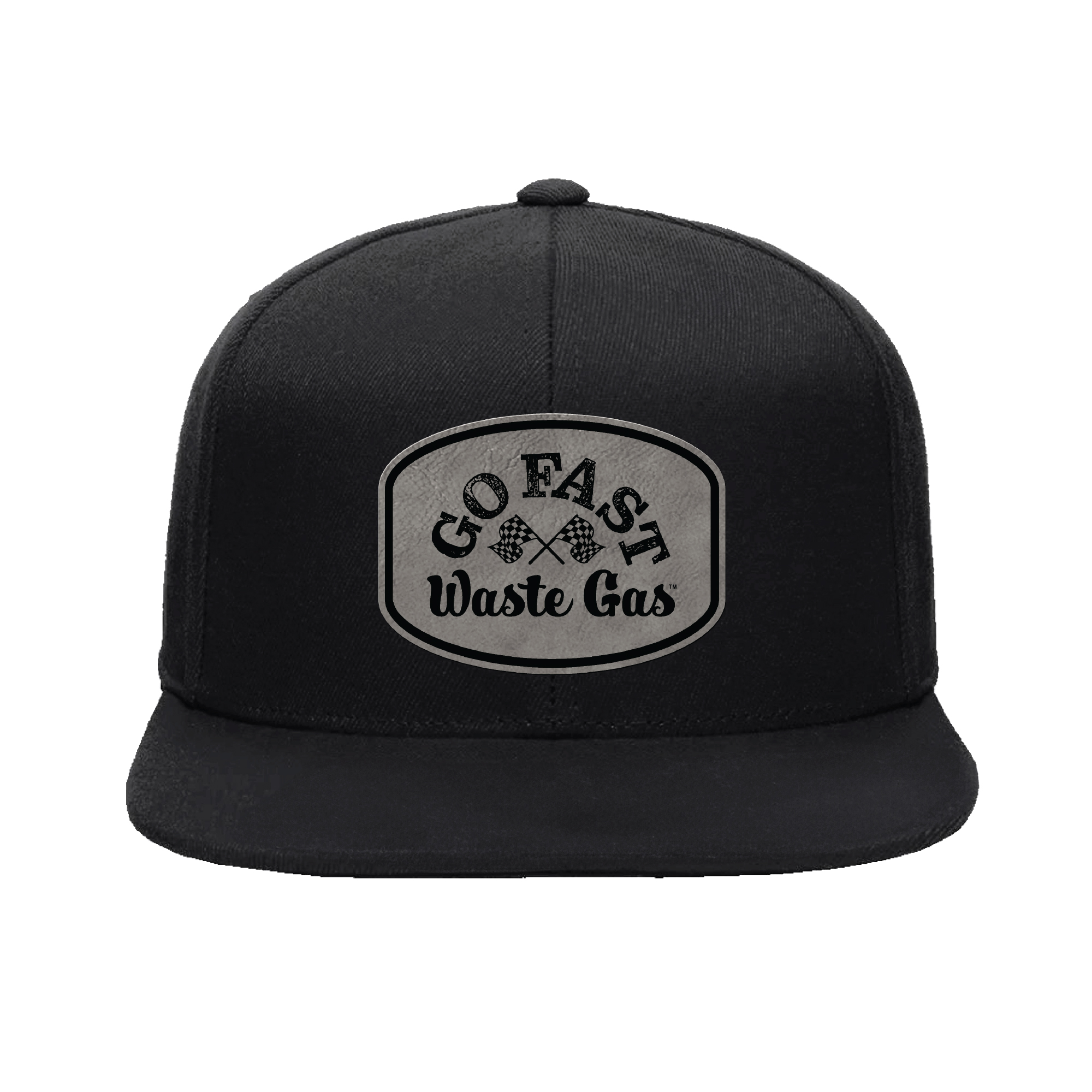 Each hat is finished with a custom grey leather patch etched with the GO FAST WASTE GAS™ mark — durable, sleek, and made to look better with mileage.