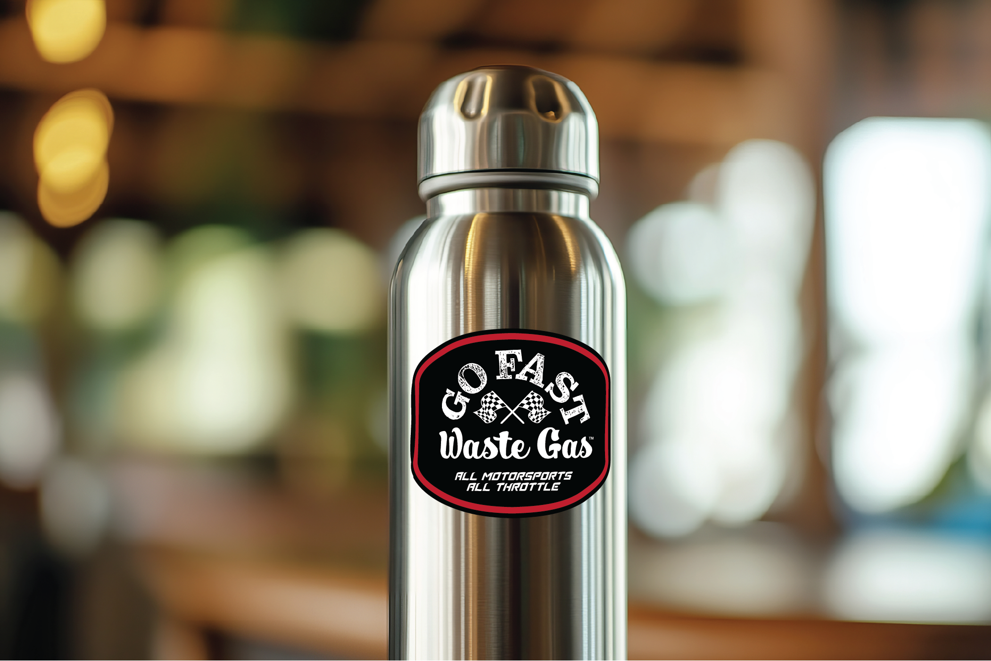 A waterproof, dishwasher-safe GO FAST WASTE GAS™ sticker made for bikes, bottles, trucks, toolboxes, coolers, and everything in between.